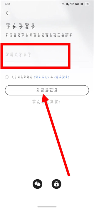 3、在登录页面,输入手机号,勾选后,点击发送验证码。