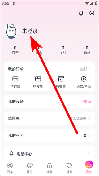 2、在我的页面,点击未登录,进入登录流程。