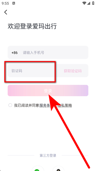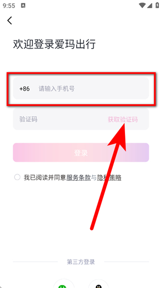 3、在登录爱玛出行页面,输入手机号,点击获取验证码。