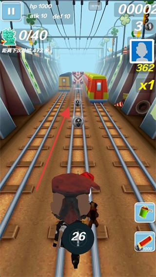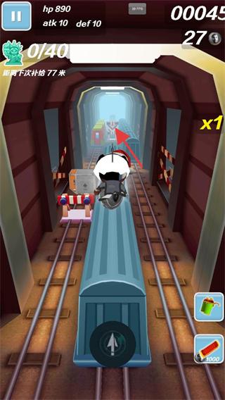 1、沿轨道奔跑,收集头像道具累计0/40进度,避开列车障碍,右侧饮料可恢复hp,持续推进距离。