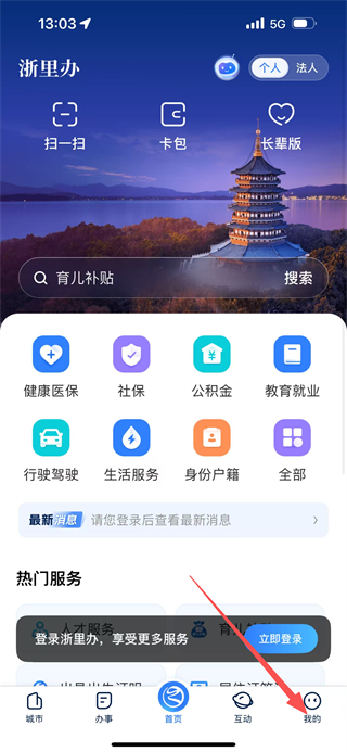 2、在浙里办主页面,点击底部的我的选项,进入登录页面。