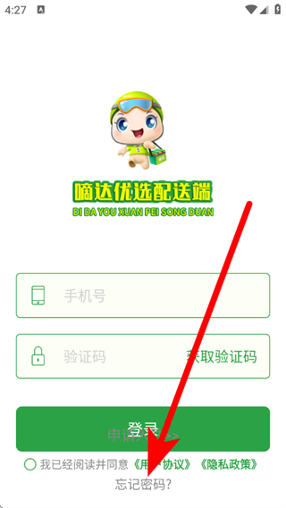 1、打开嘀达优选配送端,在登录页面,点击忘记密码,进入找回密码页面。