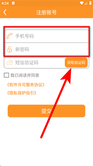 4、在输入框,输入短信验证码,勾选协议后,点击提交,完成账号注册。