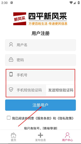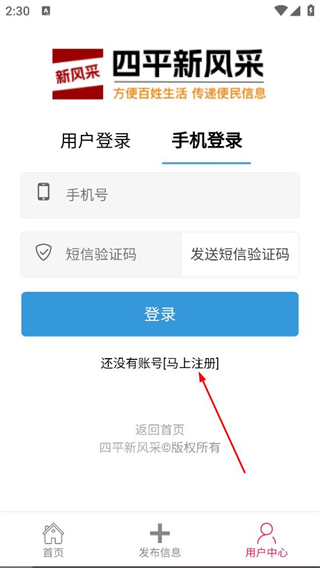 1、在四平新风采首页,点击底部用户中心,进入登录页面。