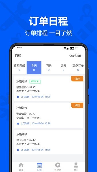 4、订单进度和日程一目了然,方便用户和师傅的查看。