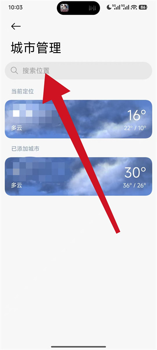 2、在城市管理页面,点击搜索位置搜索框,进入城市搜索页面。