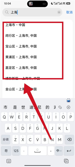 3、在搜索框中输入要添加的城市,在搜索结果里选择目标城市的区域。