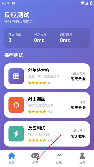 1、在反应测试首页,点击底部的测试选项,进入更多测试页面。