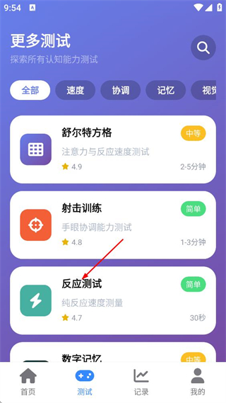 包含数字记忆测试、视觉记忆测试、反应速度测试、极速点击训练等多样项目,每个项目设计贴合认知原理,既有记忆复现类任务,也有手眼协调类挑战,体验丰富不枯燥。