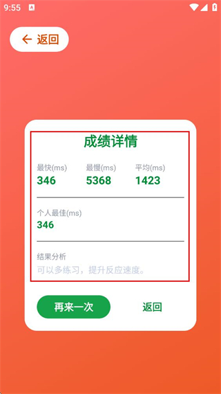 5、测试完成后,页面会展示成绩详情,可查看最快、最慢、平均反应时间及个人最佳等测试数据。