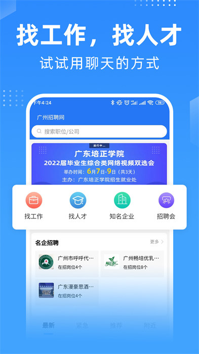 2.广州权威的求职平台,丰富的求职招聘资源,帮助你找到心仪的工作和靠谱的人才。达到自己的求职招聘目的。