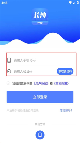 1、在长沙住房登录界面输入手机号码,点击获取验证码并输入验证码。