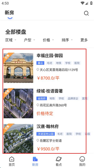 4、在新房界面可查看全部楼盘信息,如幸福庄园御园等楼盘的区域、价格等内容。