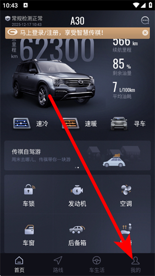 1、打开智慧传祺,在首页点击底部的我的,进入个人页面。