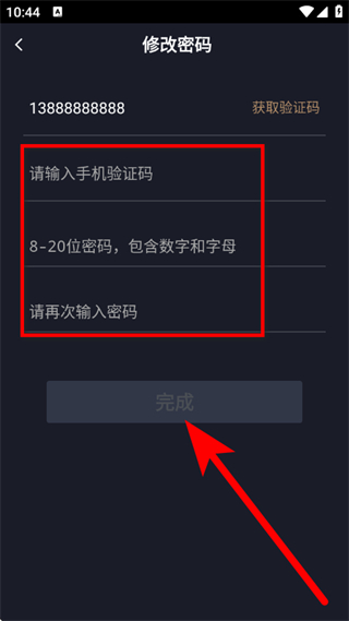 4、在修改密码页面,输入手机验证码和设置密码,点击完成,完成密码修改。