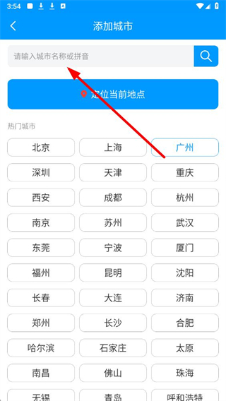 3、在添加城市界面,可通过搜索框输入城市名,或直接选择热门城市列表中的目标城市完成添加。