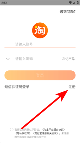 2、在淘宝登录页面,点击注册选项,进入手机号注册页面。