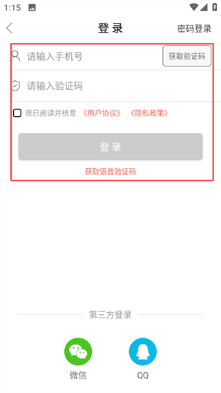3、在登录界面,填写信息并同意协议后点击登录按钮完成操作。