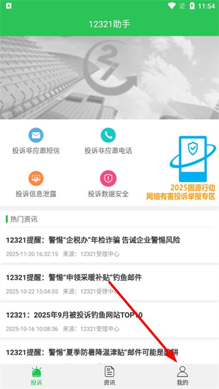 1、在12321助手app界面,找到底部导航栏我的选项并点击,进入个人页面。
