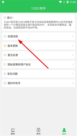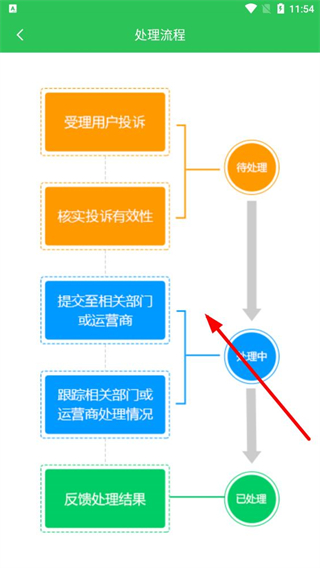 3、在处理流程页面,即可查看完整的处理流程图,包含受理投诉、核实有效性等环节及状态流转。