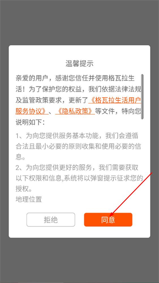 1、在格拉瓦生活的温馨提示弹窗中,点击同意,进入推荐页面。