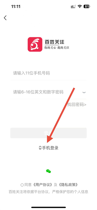 3、在登录界面里,找到手机登录选项并点击,切换至手机号验证的登录界面。