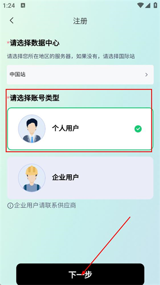3、在注册选择页面,点击下一步按钮,进入注册账号的信息填写页面。