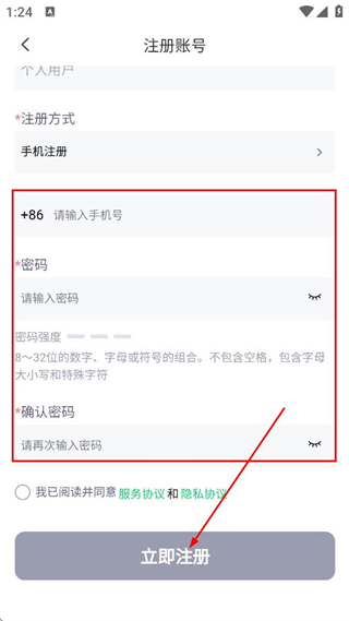 4、在页面,填写手机号、密码及确认密码,点击立即注册,完成账号注册。