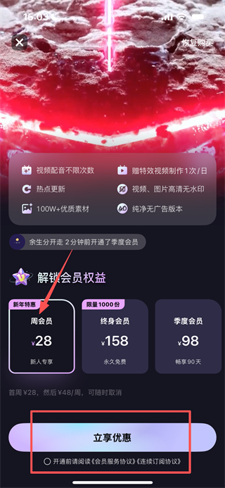 3、在会员解锁界面,选择会员类型并勾选协议后点击立享优惠完成开通。