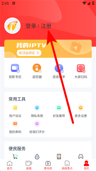 2、在我的页面,点击注册,进入注册页面。