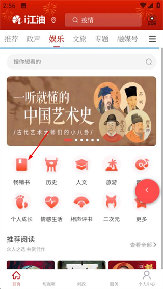 2、在娱乐频道页面,点击阅读选项进入阅读分类界面。