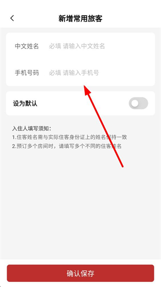 4、在新增常用旅客页面,依次填写信息,确认无误后点击确认保存,完成住客信息添加。