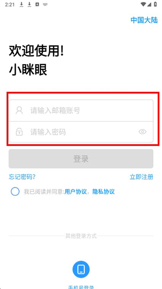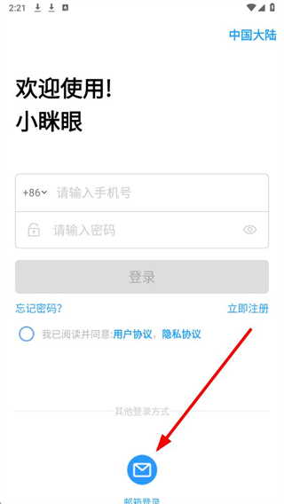 1、在小眯眼app登录界面,找到底部的邮箱登录按钮并点击,切换至邮箱登录的输入界面。