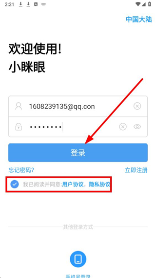 3、勾选同意用户协议选项,确认邮箱账号与密码填写正确后,点击登录按钮完成账号登录操作。