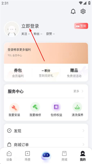2、在个人中心页面,点击立即登录按钮进入TCL登录界面。