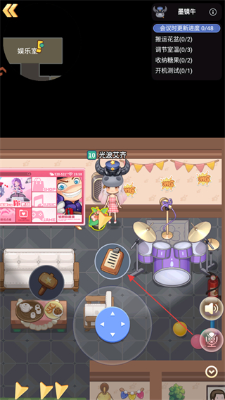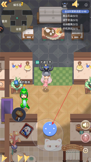 2、在娱乐室场景,操控角色移动,与其他玩家互动,准备参与游戏玩法。