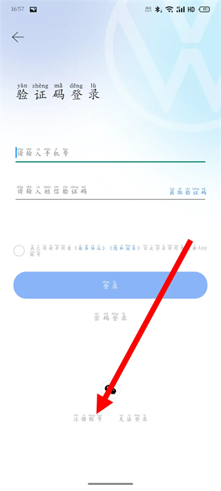 3、在验证码登录页面,点击注册账号,进入注册页面。