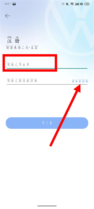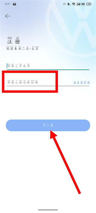 5、在输入框中输入短信验证码,点击下一步,完成注册。