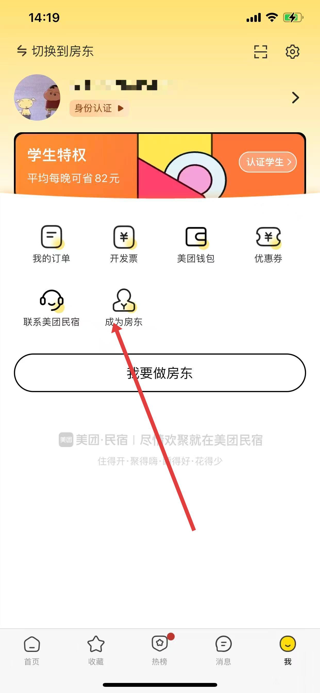 2、在我的页面中,找到并点击成为房东选项。