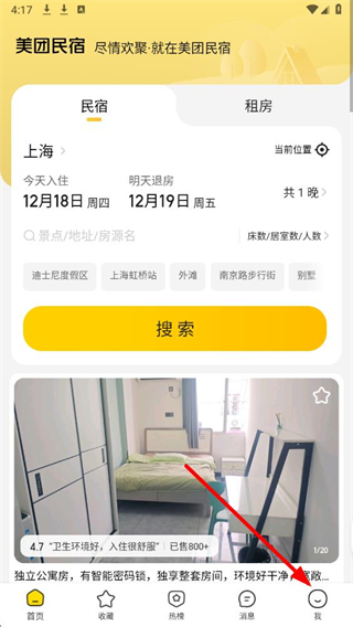 1、在美团民宿app界面,点击底部我的选项,进入我的页面。