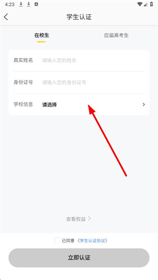 4、按照学生认证流程的提示,填写学生身份信息,点击认证即可完成学生身份的认证。