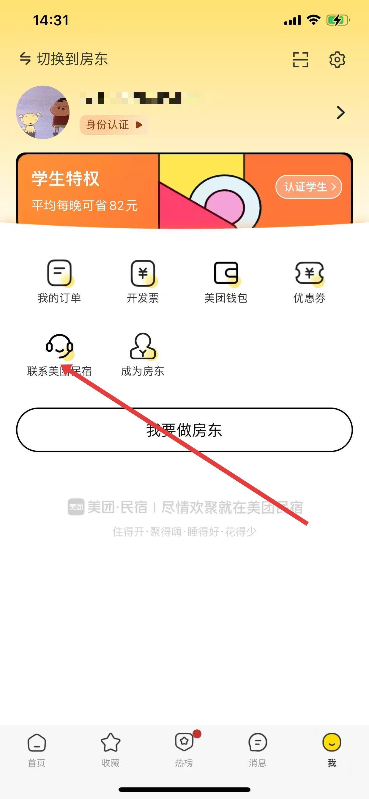 2、在我的页面中,点击联系美团民宿选项。
