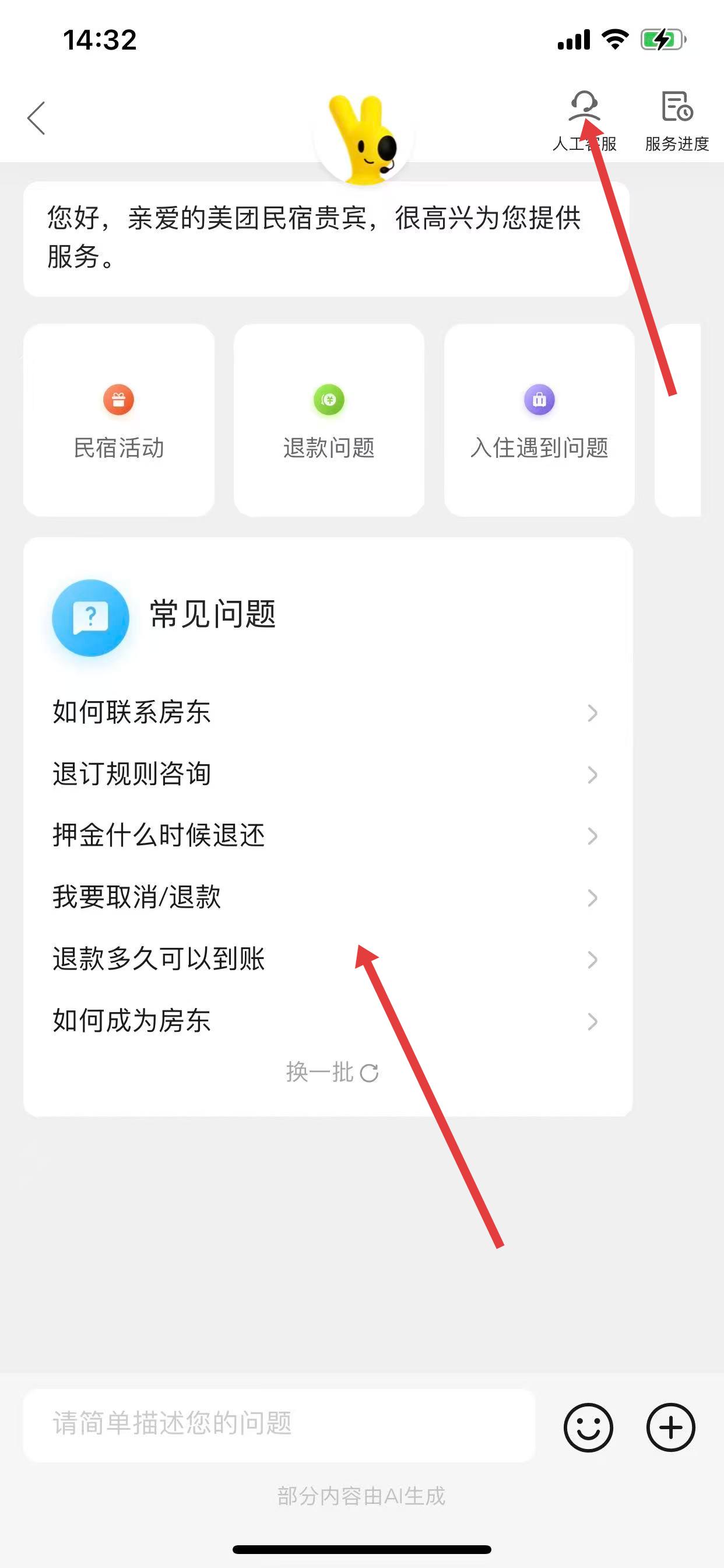 3、进入客服对话界面后,可以先查看常见问题,或者点击右上角的人工客服。