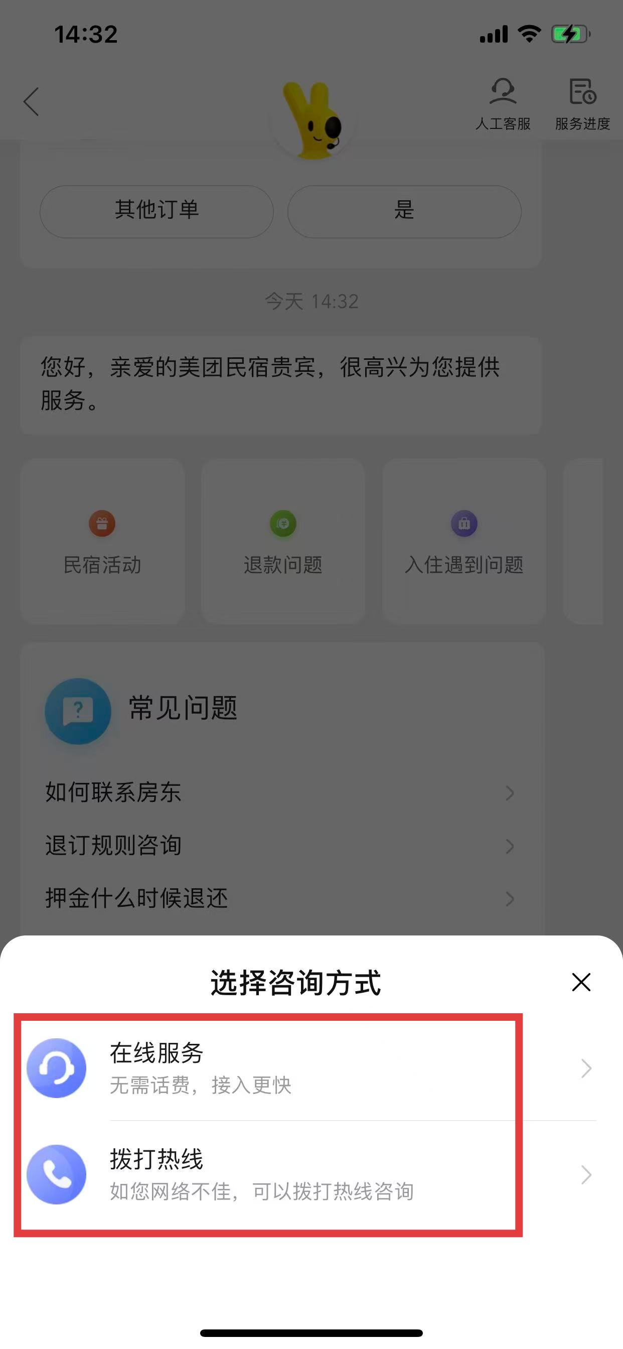 4、在弹出的选择咨询方式界面,可以选择在线服务或拨打热线来联系客服。