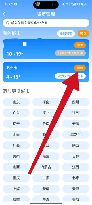 4、找到需要删除的城市,点击该城市右侧的删除,即可删除操作。