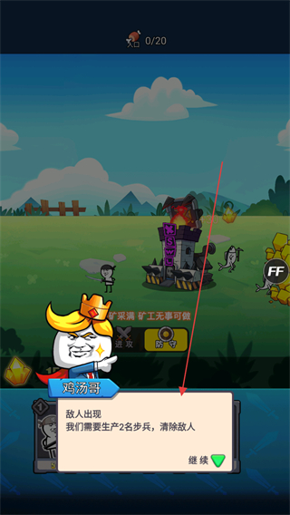 1、按提示需生产2名沙步兵,点击继续推进,准备生产单位抵御敌人。