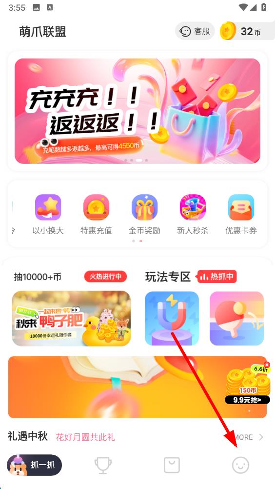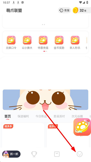 1、打开萌爪联盟app,在首页找到底部的个人图标并点击,进入个人页面。