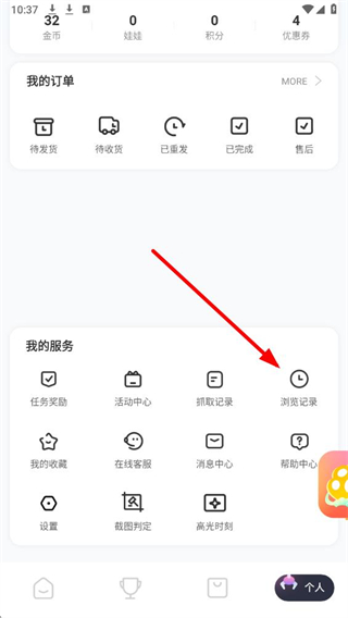 2、在个人页面我的服务板块中,找到浏览记录选项并点击,进入对应记录页面。