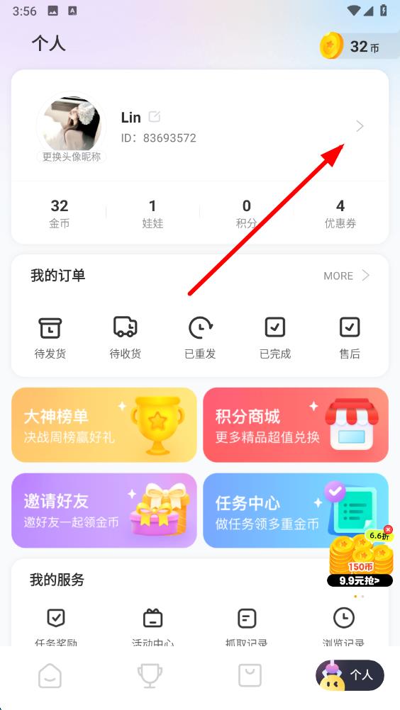 2、在个人界面中,点击头像右侧的箭头,进入个人资料页面。