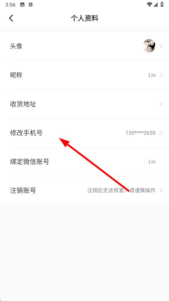 3、在个人资料页面里,找到修改手机号选项并点击,进入修改手机号界面。